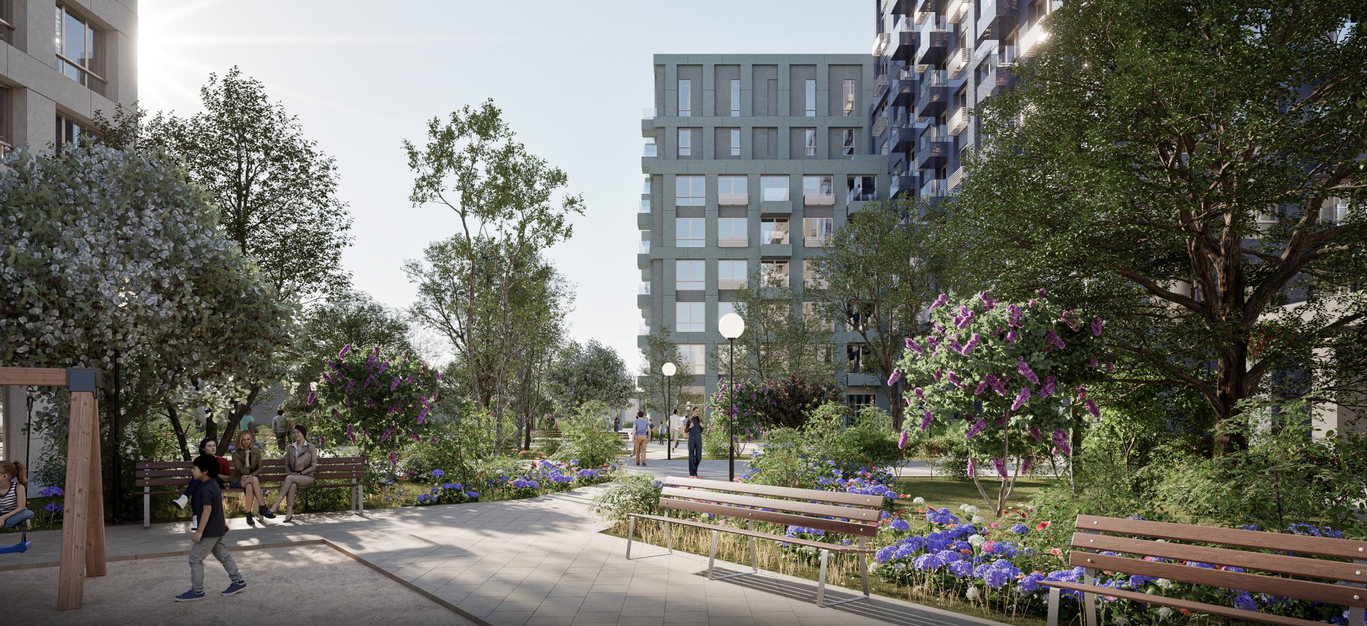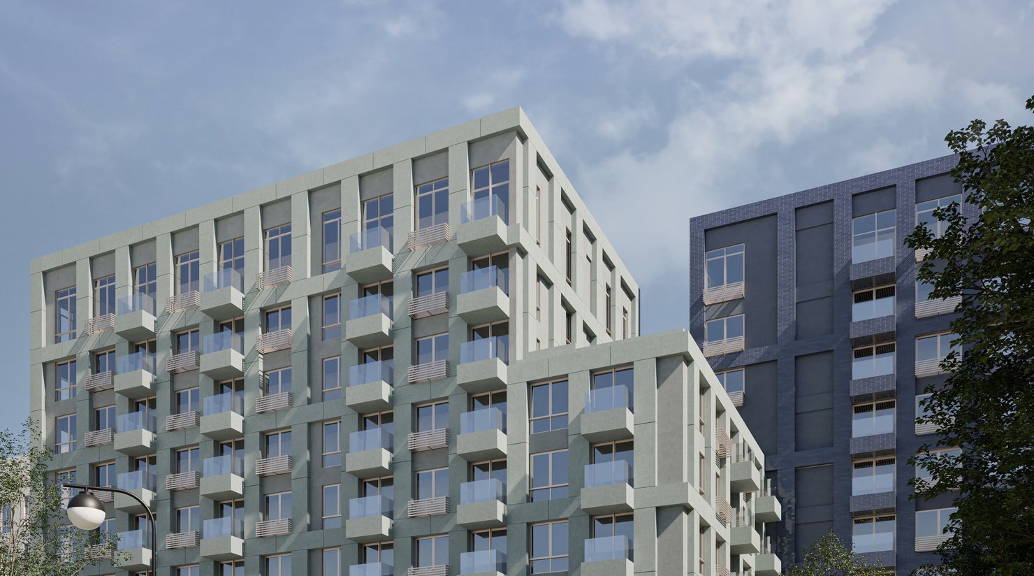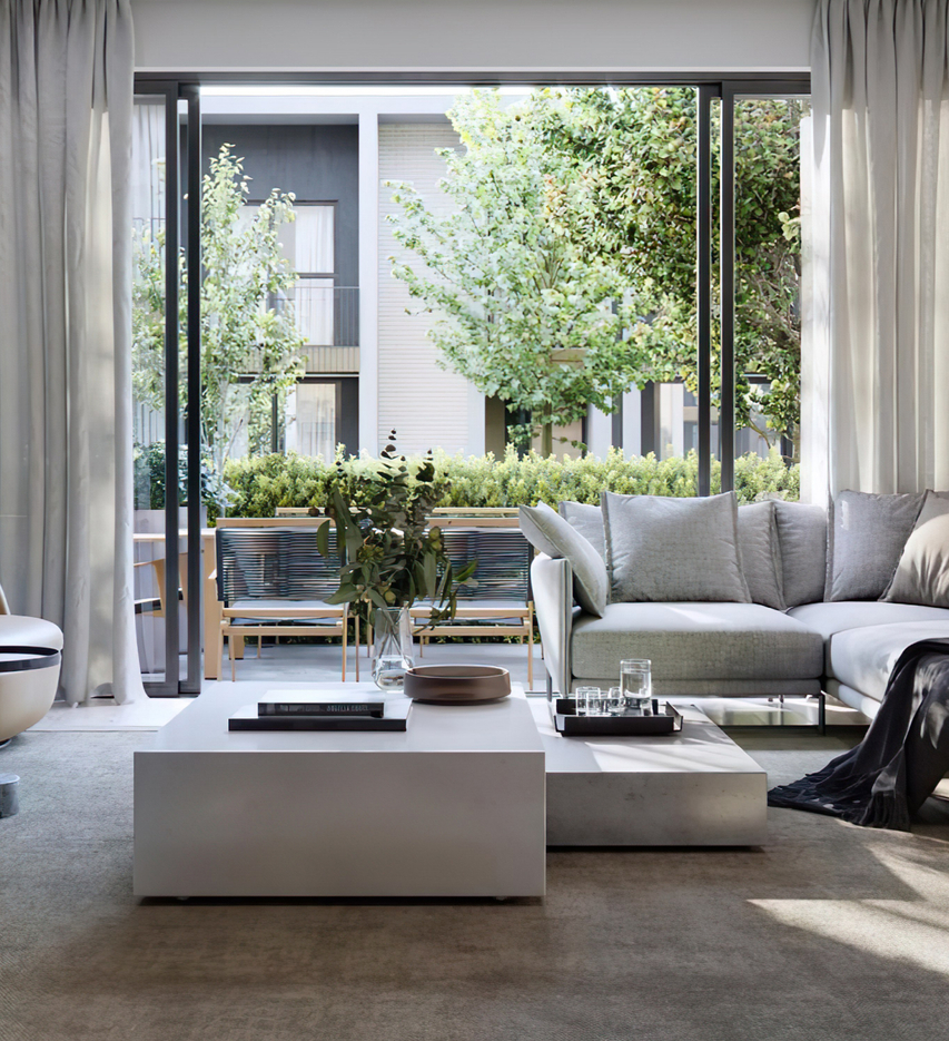 Просторные квартиры на верхних этажах. Гостевое пространство на первом уровне, приватное — на втором. Из больших окон открываются завораживающие виды на город.