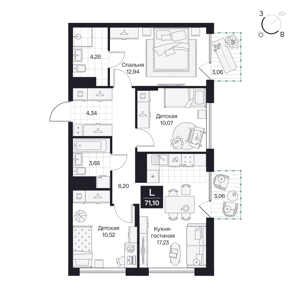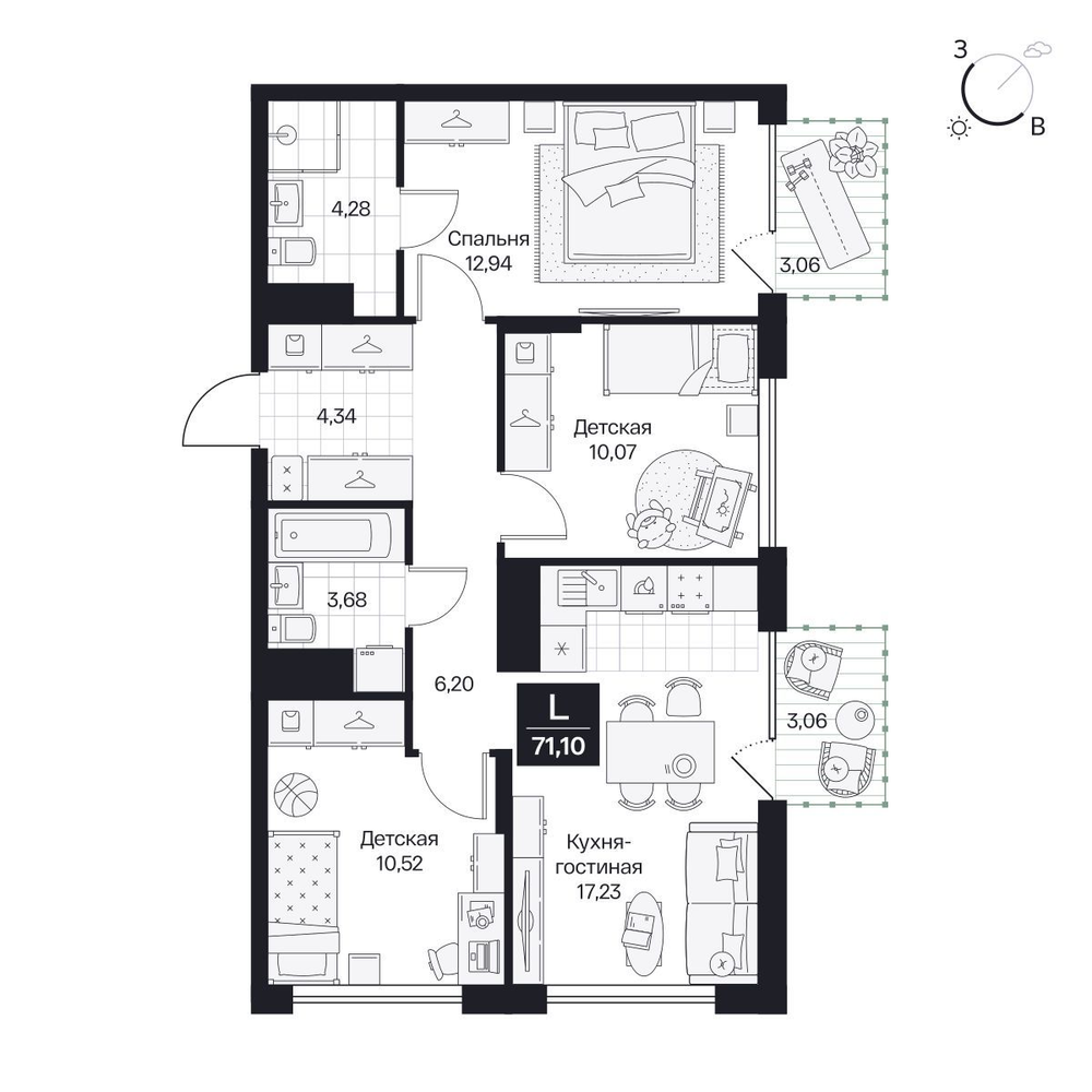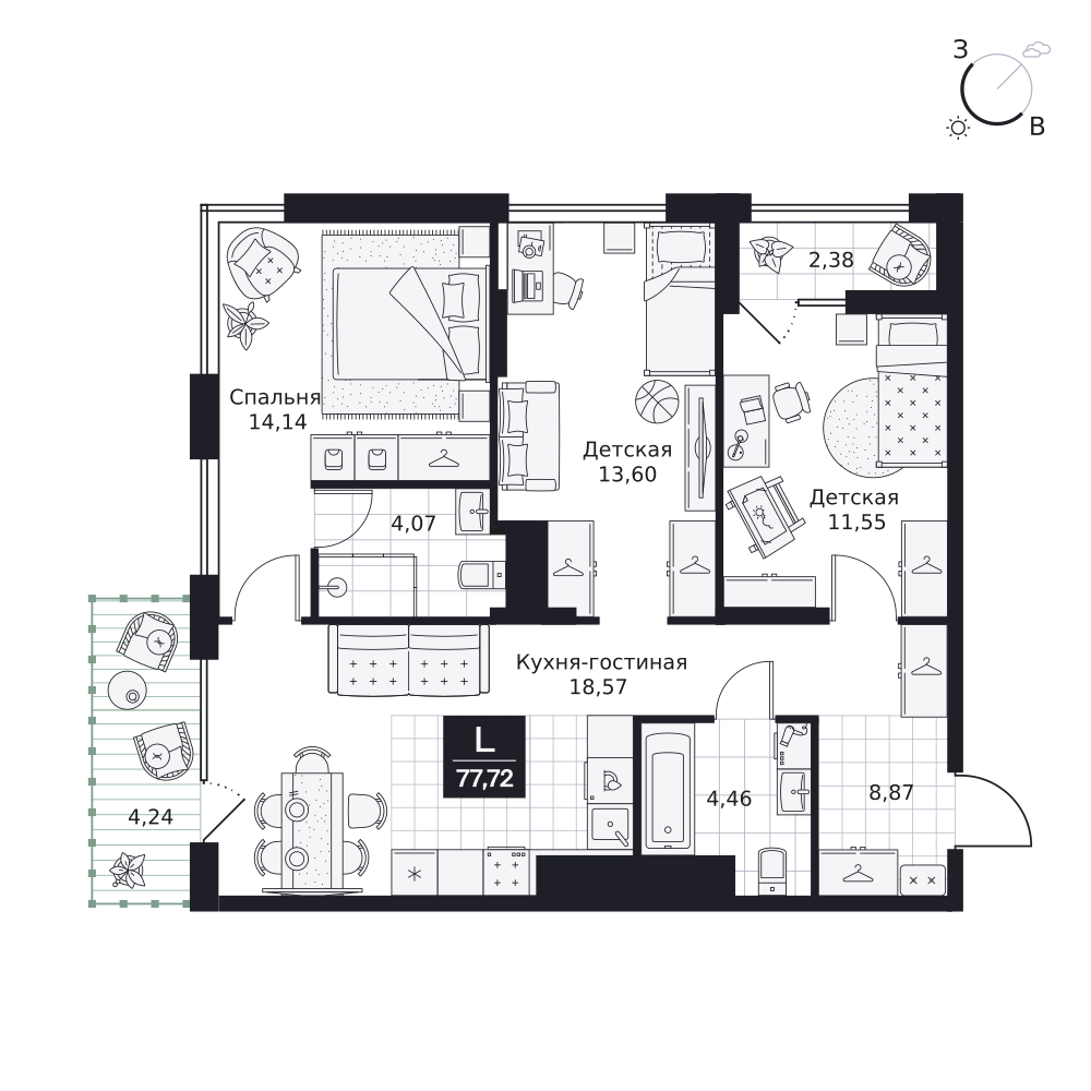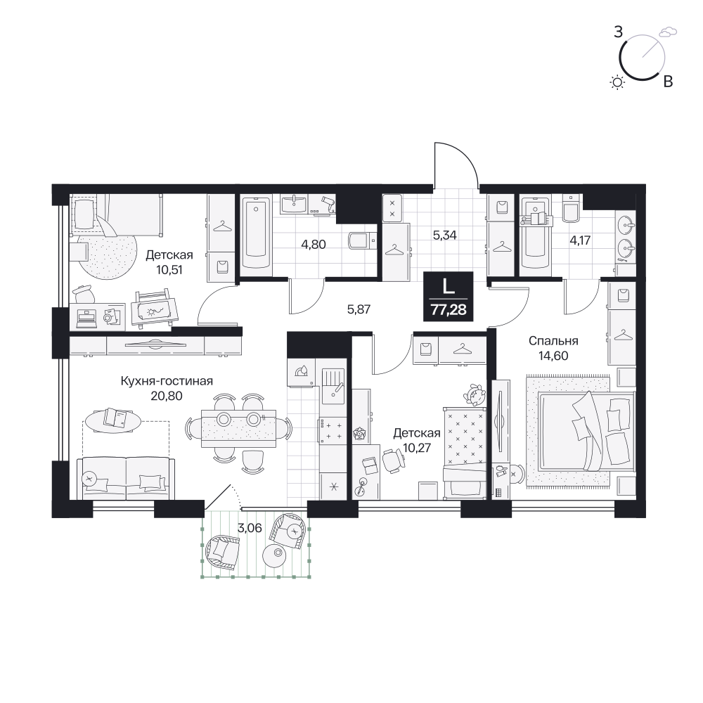 3-комнатная  77.28 м2