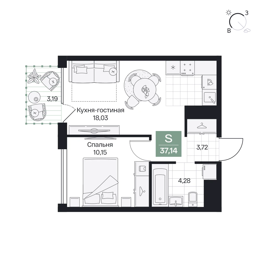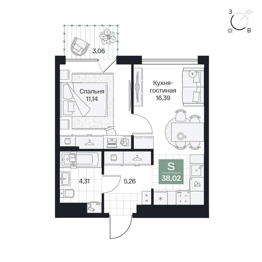1-комнатная  38.54 м2