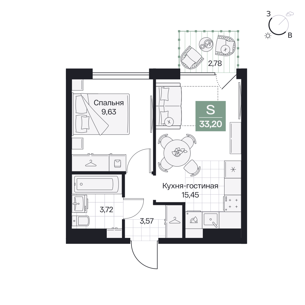 Студия  33.32 м2